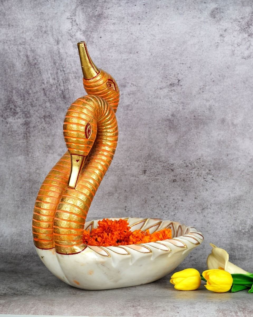 Fascinating swan-shaped urli made from marble and intricately carved and detailed with beautiful designs and colours. Water kept in an urli is considered very auspicious, besides this, it can be used for various purposes and also can be kept as an item of home décor.